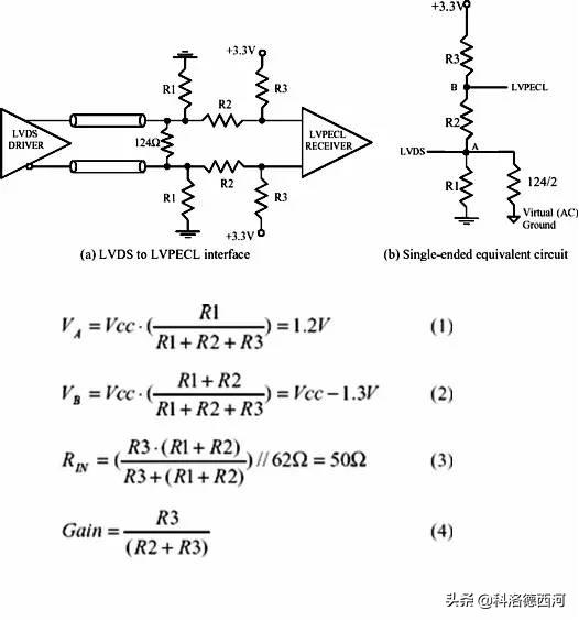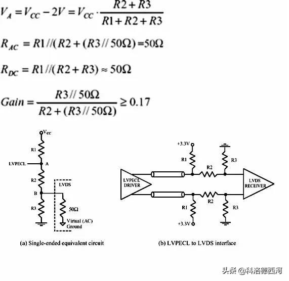 注意LVDS 的输入差分阻抗为100Ω,或者每个单端到虚拟地为50Ω,该阻抗不提供直流通路,这里意味着LVDS输入交流阻抗与直流阻抗不等。LVPECL到LVDS 的直流耦合所需的电阻网络需满足下面方程组: