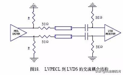 LVPECL到LVDS 的交流耦合结构如图18 所示,LVPECL的输出端到地需加直流偏置电阻(142Ω到200Ω),同时信号通道上一定要串接50Ω电阻,以提供一定衰减。LVDS 的输入端到地需加5KΩ电阻,以提供共模偏置;